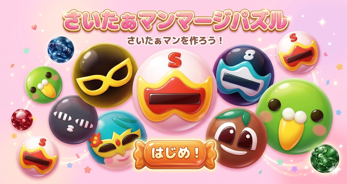 さいたぁマンマージパズルであそぼう! 竜神、狼神、兎神メダルを落として、さいたぁマンを作ろう! |